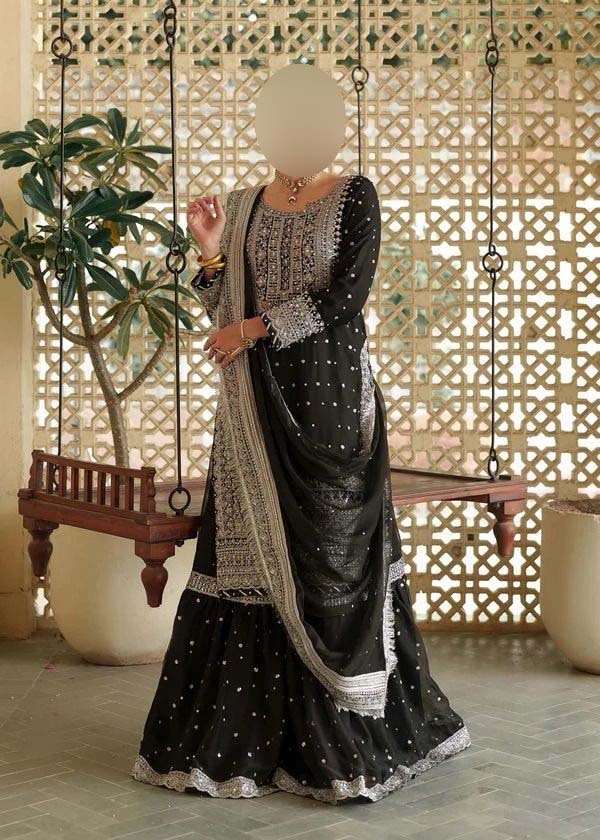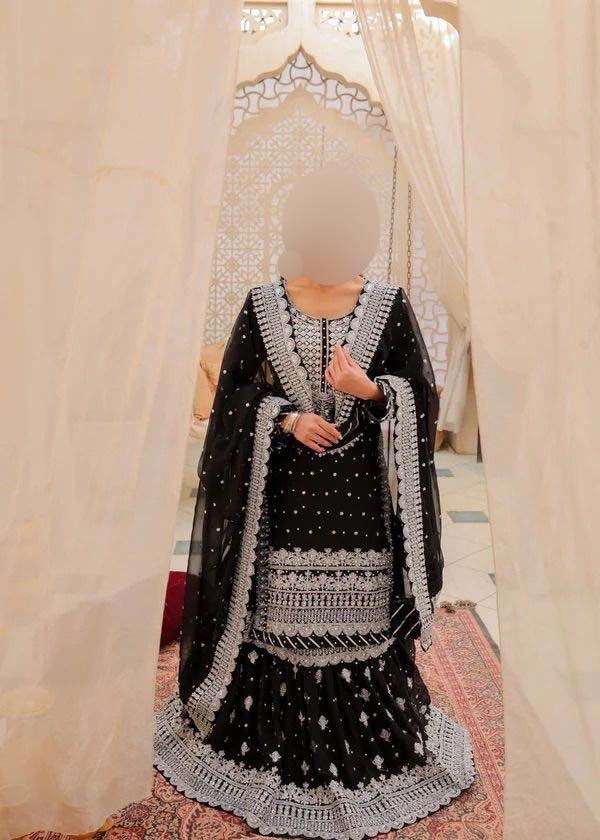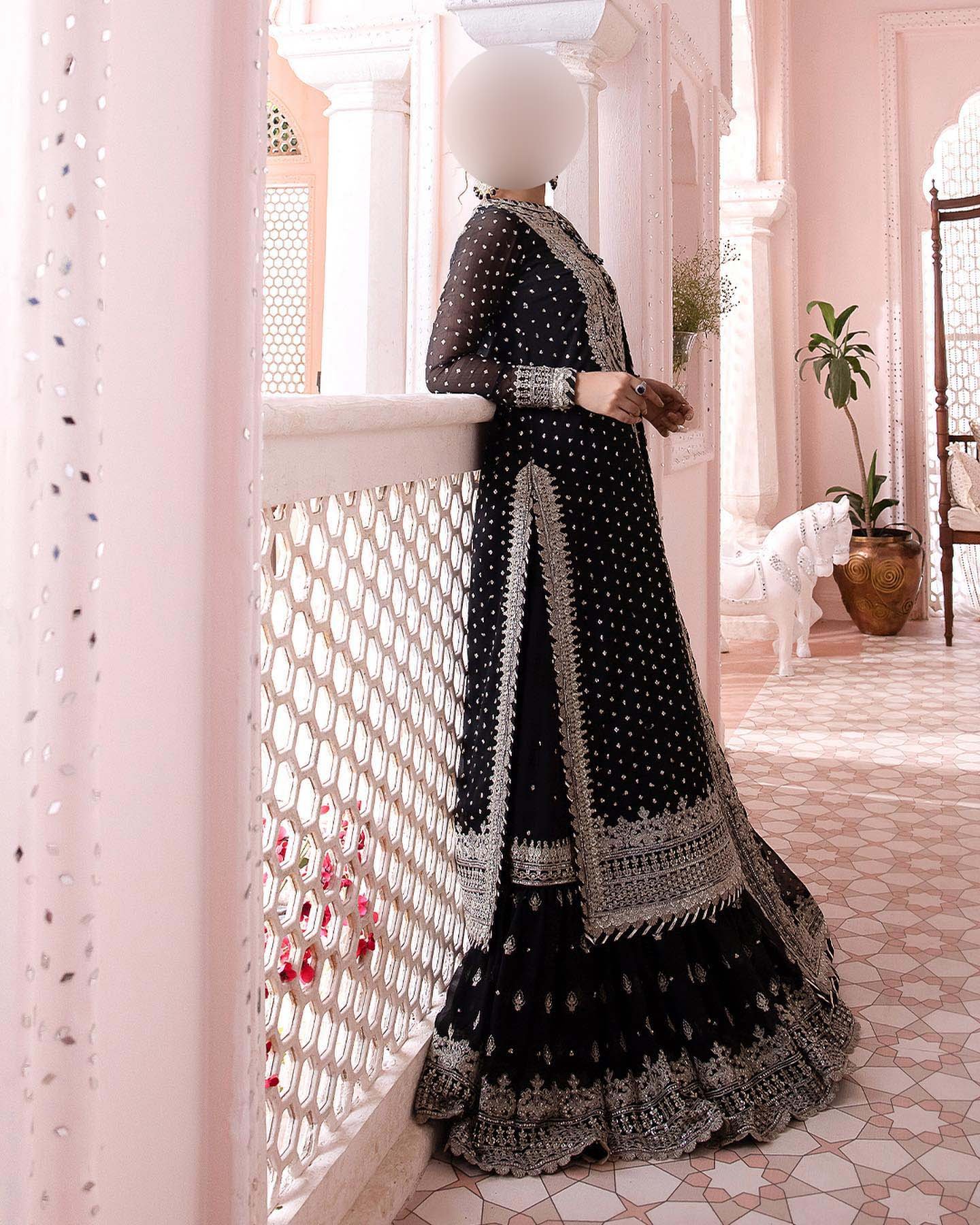 • Chiffon fully embroidered spengle work back featuring heavy embroidered bunch, daman border, and back chak lace.