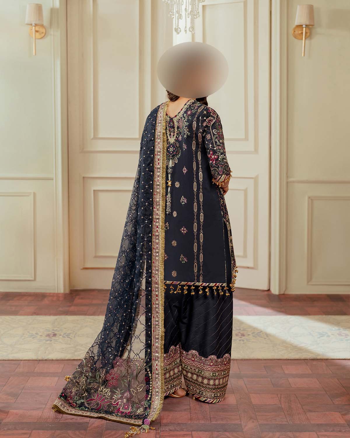 • Raw silk back beautifully adorned with alternate spengle embroidery and matching embroidered daman border