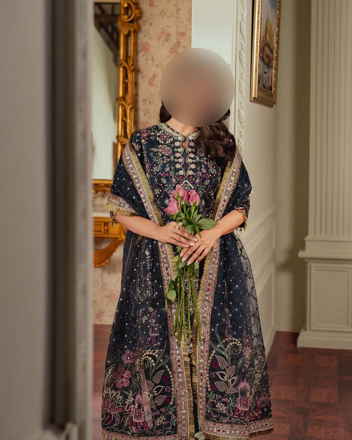 • Luxurious organza dupatta embellished with full heavy spengle embroidery, featuring two-side pallou borders and four-side zari lace finishing for a premium touch