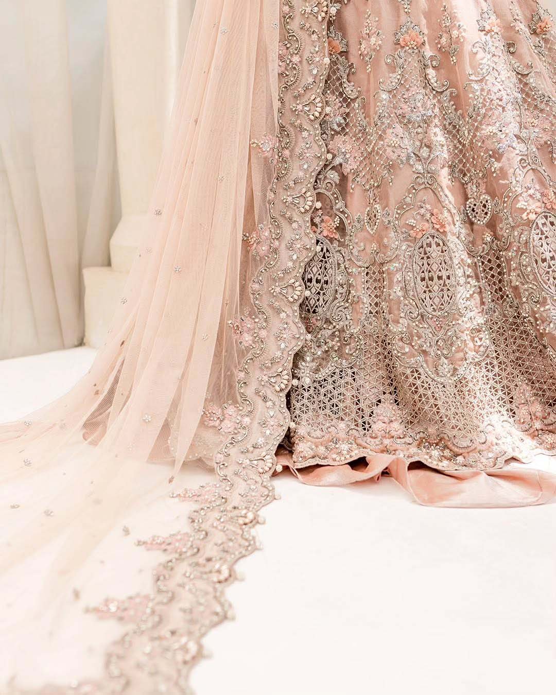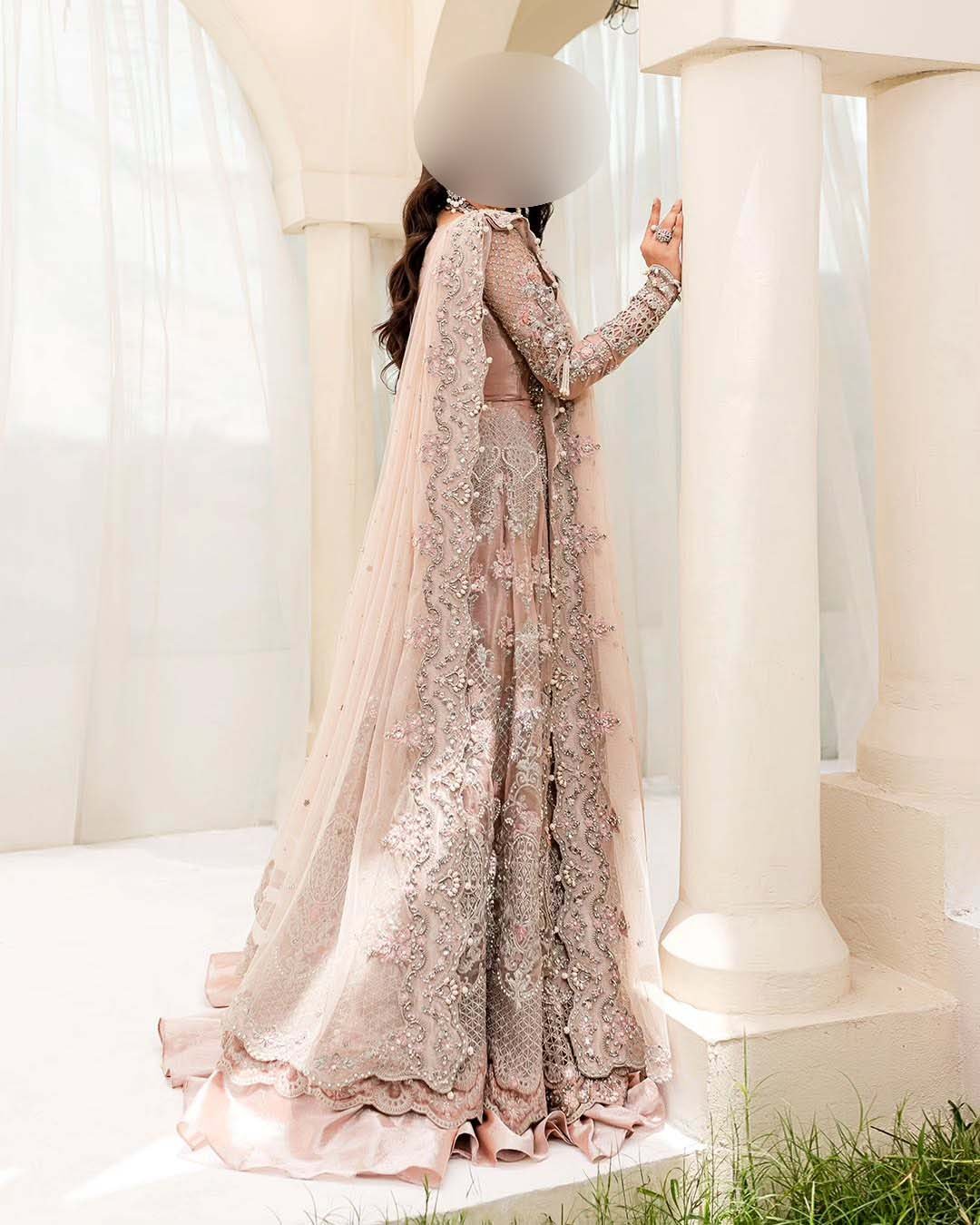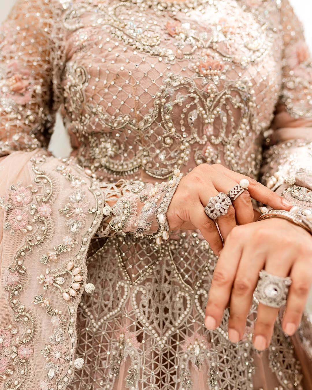 • Embroidered sleeves showcasing subtle sequence work, enhanced with 3D flowers, pearls, and moti embellishment