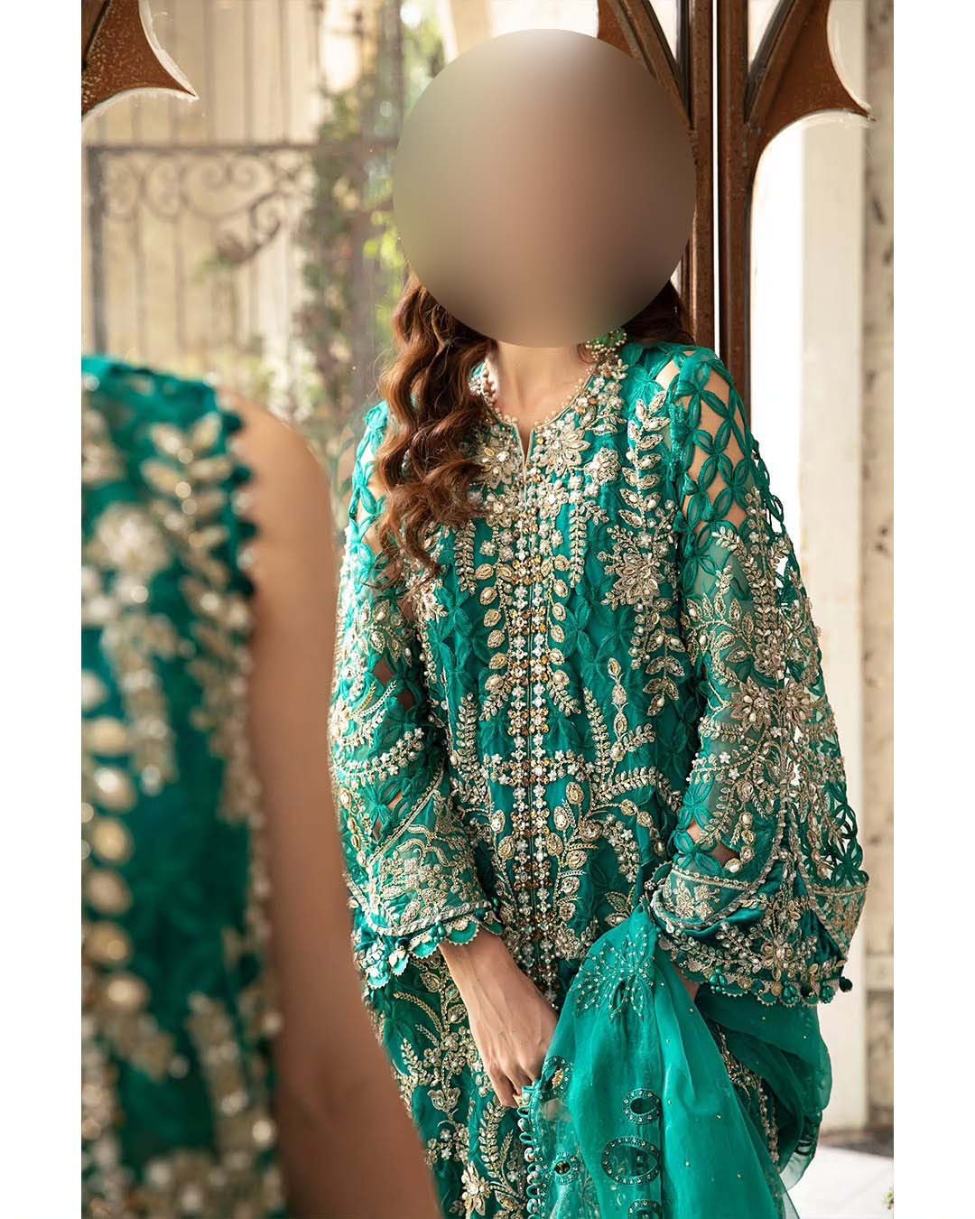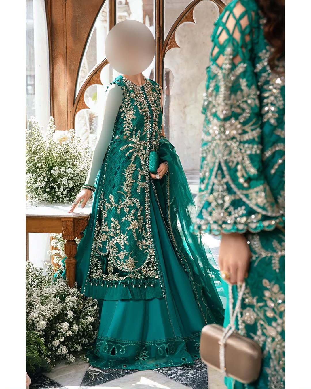 • Organza front crafted with fully heavy embroidered right and left spengle work panels, detailed with intricate adda hand embellishment