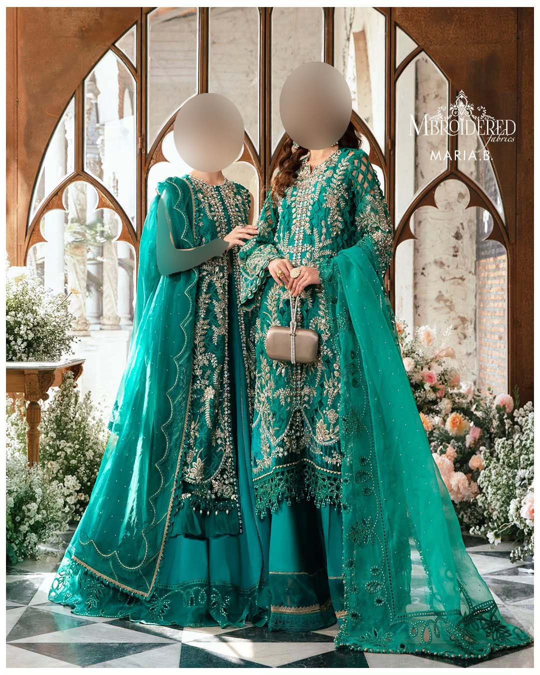 • Organza sleeves with alternate heavy spengle embroidery, enhanced with adda handwork and embroidered daman borders